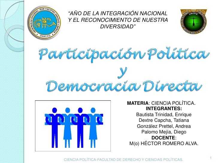 El objetivo de estos mecanismos es incentivar a la participación colectiva y directa en los procesos de toma de decisión más allá de la elección de sus representantes Zovatto 2007. La práctica de instituciones de democracia directa en América Latina. Democracia Directa es un Partido Político peruano legalmente inscrito en el ROP JNE de acuerdo a Ley y por tanto facultado para actuar en los procesos electorales y en la política peruana Registro de organizaciones políticas resolución Nº 226 -2013-ropJNE lima 11 de diciembre de 2013.