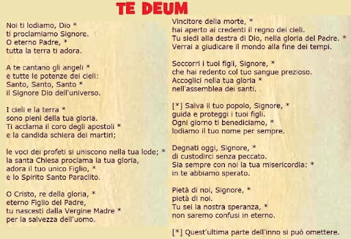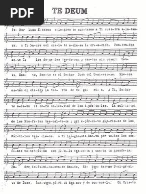 A Ti eterno Padre te venera toda la creación. Santo Santo Santo es el Señor Dios del universo. El Te Deum es un himno de acción de gracias que es entonado generalmente en la liturgia de las horas y en ciertas celebraciones religiosas así como en los ritos romano y anglicano.