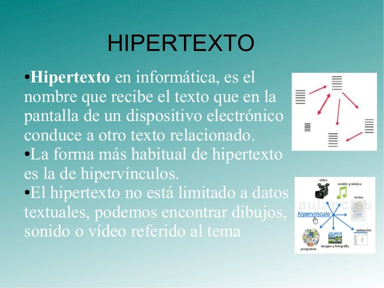 Hipertexto como documento con hiperenlaces. Es una herramienta con estructura no secuencial que permite crear agregar enlazar y compartir información de diversas fuentes por medio de enlaces asociativos. Hipertexto es la presentación de información como una Red de nodos enlazados a través de los cuales los lectores pueden navegar.